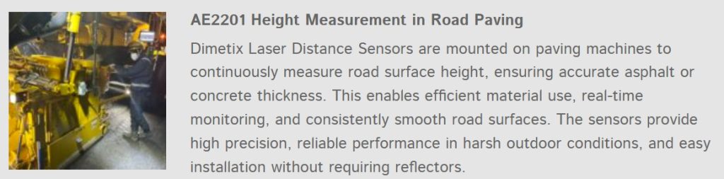 道路の舗装工事においては、アスファルトやコンクリートをどの程度の厚さで舗装するか、もしくは舗装前に古い舗装をどの程度の厚さ剥がしたかを計測する必要があります。Dimetix社のレーザー距離センサーは舗装用重機の外側に路面へ向けて装着され、連続的に高さを計測することができます。その計測システムを併用して舗装工事を行うことによって、無駄なく舗装用資材(アスファルトやコンクリート)を使うことが出来て、使用量も把握することが出来、しかも平滑に仕上げることが出来ます。